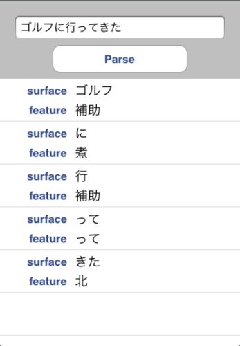 https://github.com/FLCLjp/iPhone-libmecab こちらに上げられている mecab を用いて形態素解析を行うサンプルアプリで、どういう結果がでるのか試してみました。 入力文1:ゴルフに行ってきた 入力文2:ゴルフ行ってきた うーん、微妙だ。。 キーワード抽出的…