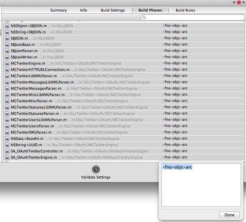 プロジェクト全体でARCを有効にした状態で、一部ファイルを無効にしたい場合は、 1. プロジェクト設定画面のBuild Phasesタブを開く 2. ARCを無効にしたいファイルをまとめて選択 3. リターンキーを押すとダイアログボックスが出てくるので、"-fno-objc-arc"…